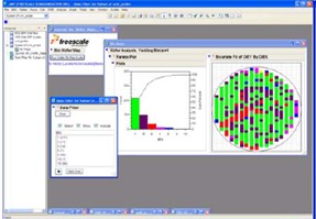 例如,飛思卡爾的工程十分用半導(dǎo)體行業(yè)中常見的晶圓圖Wafer Plot來初步分析晶圓的缺陷,以下兩個圖形就是運用JMP軟件繪制而成的。第一張圖顯示的是單個晶圓的質(zhì)量特征,并配有帕累托圖Pareto Plot展示芯片的良率狀況和各種缺陷出現(xiàn)的頻次。第二張圖則是從整體層面顯示一個批次Lot產(chǎn)品的質(zhì)量特征(一般來說,飛思卡爾規(guī)定25個晶圓組成1個批次)。