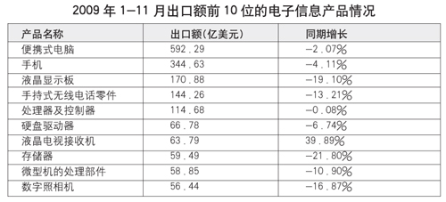 2009年1-11月,電子信息產(chǎn)品累計(jì)進(jìn)出口總額6868.78億美元,同比下降16.66%,比全國(guó)商品進(jìn)出口總額降幅低0.8個(gè)百分點(diǎn),占全國(guó)外貿(mào)進(jìn)出口總額的34.97%。
