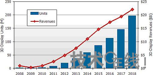 目前,3D(三維)顯示器非常引人注目。最新發(fā)布的《3D顯示器技術(shù)&市場調(diào)查報(bào)告》預(yù)測,3D顯示器市場的供貨量和供貨金額將從2008年的70萬臺(tái)、9億200萬美元增長至2018年的1億9600萬臺(tái)、220億美元(圖1)。如果市場果真按照該預(yù)測增長的話,年均復(fù)合增長率(CAGR)按金額計(jì)算將達(dá)到38%,按數(shù)量計(jì)算將達(dá)到75%。