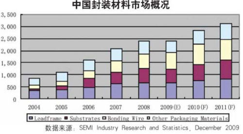 中國的半導(dǎo)體封裝材料市場在2009年將超過22億美元,比2008年增加1%左右。預(yù)計2011年達到31億美元。