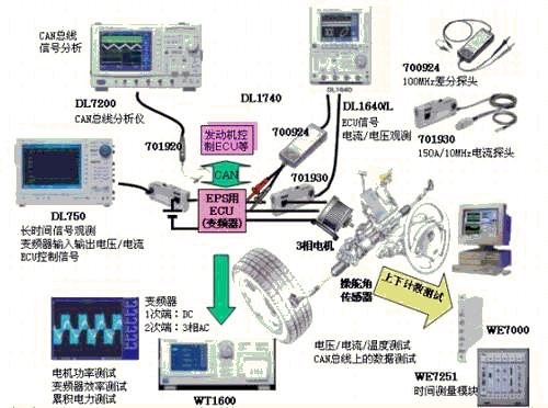 動力方向盤(EPS)在小型汽車中應用已經(jīng)比較普及了,但在需大扭矩的大型車中應用時需要采用3相電機.不同于傳統(tǒng)的DC機,測試3相交流電機需要功率計測試電力及效率.此外,ECU間采用CAN總線通信,還必須測試CAN總線信號。