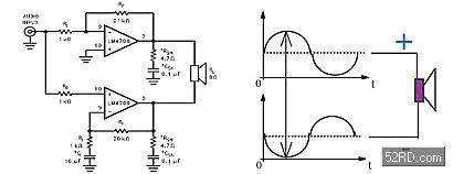 橋接式(BTL)放大器如(圖二)所示,由兩個(gè)單端式(Single-end)放大器以相差180組成,故其增益為