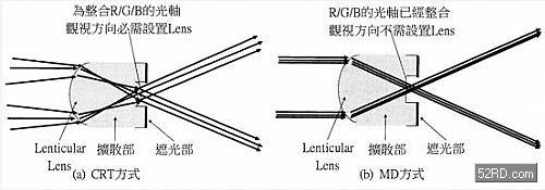 (圖四)(a)是傳統(tǒng)CRT背投電視螢幕的動作特性圖,由圖可知RGB各影像光線分別從相異方向投射到螢幕,當影像光線從螢幕出射時必需進行光線整合,因此觀視方向的螢幕表面通常會設置LenticularLens;圖四(b)是MD方式背投電視螢幕的動作特性圖,由圖可知它使用MD方式投影機投射影像,所以觀視方向的螢幕表面不需設置LenticularLens。
