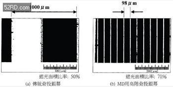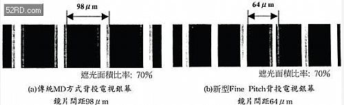 如上所述RP-TV用螢幕通常是在明亮室內環(huán)境中使用,對RP-TV螢幕而言阻斷室內外亂光提高影像對比(Contrast)非常重要。影像光線穿透時不會被遮光部遮蔽的前提下,通常開口部的面積越小,亦即遮光部的面積比率越大,遮蔽外亂光的能力越強,影像對比也越高。