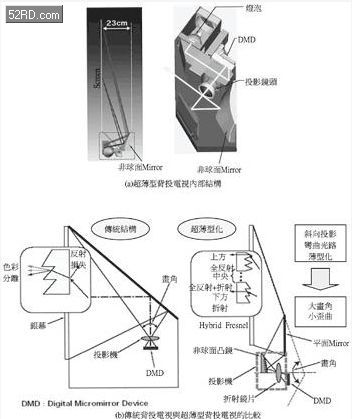 2000年日本三洋發(fā)表厚33cm、50吋背投電視,2002年三菱電機推出厚度只有23cm背投電視(圖八),該公司也于2004年突破20cm門檻,一般認為未來背投電視的厚度可望媲美電漿電視。背投電視薄型化的結果,業(yè)者必需開發(fā)特殊離軸型LenticularLensScreen與FresnelLensScreen。