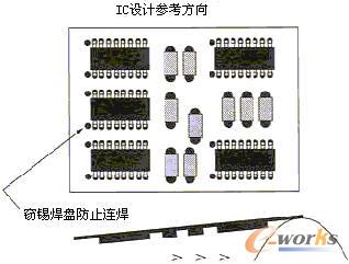 PCB上元器件的布局對生產(chǎn)效率和成本有相當重要的影響,是衡量PCB設計的可裝聯(lián)性的重要指標。一般來講,元器件盡可能均勻地、有規(guī)則地、整齊排列,并按相同方向、極性分布排列。有規(guī)則的排列方便檢查,有利于提高貼片/插件速度,均勻分布利于散熱和焊接工藝的優(yōu)化。另一方面,為簡化工藝流程,PCB設計者始終都要清楚,在PCB的任一面,只能采用回流焊接和波峰焊接中的一種群焊工藝。這點在組裝密度較大、PCB的焊接面必須分布較多貼片元器件時,尤其值得注意。設計者要考慮對焊接面上的貼裝元件使用何種群焊工藝,最為優(yōu)選的是使用貼片固化后的波峰焊工藝,可以同時對元件面上的穿孔器件的引腳進行焊接;但波峰焊接貼片元件有相對嚴格的約束,只能焊接0603及以上尺寸的片式阻容﹑SOT﹑SOIC(引腳間距≥1mm且高度小于2.0mm)。分布在焊接面的元器件,引腳的方向宜垂直于波峰焊接時PCB的傳送方向,以保證元器件兩邊的焊端或引線同時被浸焊,相鄰元件間的排列次序和間距也應滿足波峰焊接的要求以避免“遮蔽效應”,如圖1。當采用波峰焊接SOIC等多腳元件時,應于錫流方向最后兩個(每邊各1)焊腳處設置竊錫焊盤,防止連焊。