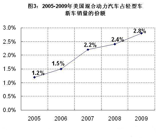 雖然美國(guó)的混合動(dòng)力汽車銷量近兩年有所下滑,但混合動(dòng)力汽車在美國(guó)新車總銷量中的份額(見(jiàn)圖3)卻逐年上升——從2005年的1.2%逐漸上升至2009年的2.8%,未出現(xiàn)滑落。