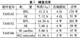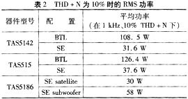 TexasInstruments還提供具有數(shù)字增益控制功能的RMS功率測量方式,使THD+N≤10%。利用TI公司的TAS5508或TAS5086型調(diào)制器,可以實現(xiàn)數(shù)字增益。THD+N為10%時的平均功率要高于正常FTC的THD+N<1%時的額定功率。表2列出了THD+N為10%時的平均功率。