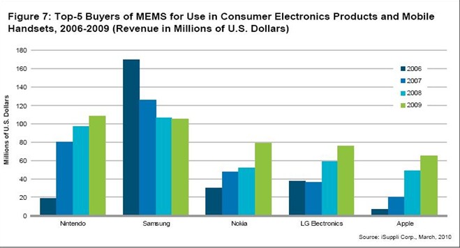 據(jù)iSuppli公司,日本任天堂在2009年超越韓國(guó)的三星,成為用于消費(fèi)電子產(chǎn)品和手機(jī)的微機(jī)電系統(tǒng)(MEMS)的全球最大買(mǎi)家。