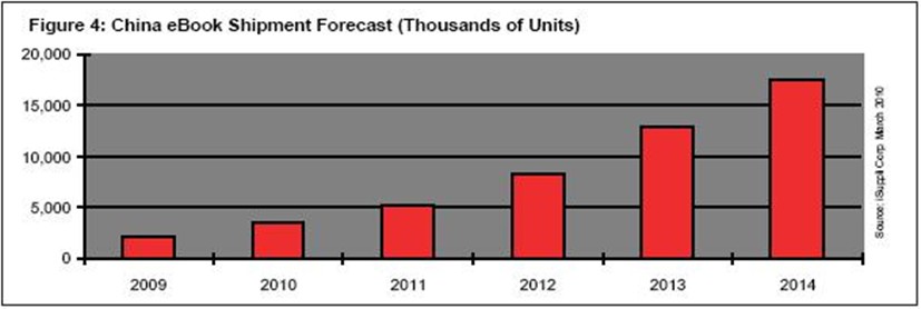 據(jù)iSuppli公司,2010年中國市場(chǎng)的電子書出貨量將達(dá)到360萬個(gè),比2009年的210萬大增70.7%。到2014年,中國市場(chǎng)的電子書出貨量將達(dá)到1760萬個(gè)。