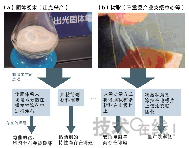 出光興產(chǎn)數(shù)年前就在開發(fā)用于固體電解質(zhì)的粉末狀“硫化物類鋰鹽”(出光興產(chǎn))的全固體鋰離子充電電池。最近的進(jìn)展主要有兩點(diǎn):①尺寸從名片大小加大到了A6大小,②省去了以前輸出功率時(shí)所需要的數(shù)kgf/cm2壓力。不過,目前還存在彎曲性和電解質(zhì)均一性的課題,需要進(jìn)一步改進(jìn)制造工藝(圖1)。