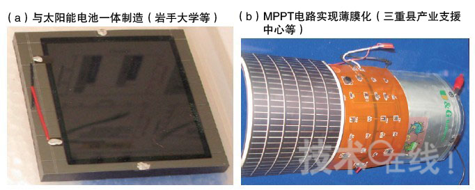 (b)為三重縣產(chǎn)業(yè)支援中心等的開發(fā)示例,與太陽能面板、最大功率點(diǎn)跟蹤(MPPT)電路,以及鋰聚合物充電電池進(jìn)行了組合。