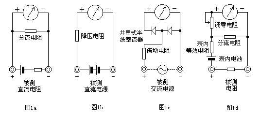 如圖1d所示,在表頭上并聯(lián)和串聯(lián)適當?shù)碾娮瑁瑫r串接一節(jié)電池,使電流通過被測電阻,根據(jù)電流的大小,就可測量出電阻值。改變分流電阻的阻值,就能改變電阻的量程。