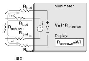四線歐姆法是測量小電阻的最精確方法。用這種方法能自動(dòng)扣除測試線電阻和接觸電阻。四線電阻測量連接見圖2。使用一個(gè)已知電流源和測量電阻器產(chǎn)生的電壓,就能計(jì)算出未知電阻值。一組附加測試線用來承載至未知電阻器的電流,在它上面產(chǎn)生的電壓可通過電壓感應(yīng)線測量。沒有電流流過電壓感應(yīng)線,因此它也不會(huì)產(chǎn)生電壓降。