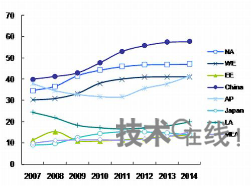 2010年中國(guó)的電視市場(chǎng)規(guī)模將達(dá)到4800萬(wàn)臺(tái),按供貨量計(jì)算,規(guī)模為全球最大。其他新興市場(chǎng)國(guó)家的需求2010年也將開始恢復(fù)。到2014年,亞太地區(qū)的電視供貨量將超過西歐,新興市場(chǎng)國(guó)家將推動(dòng)全球電視市場(chǎng)擴(kuò)大。