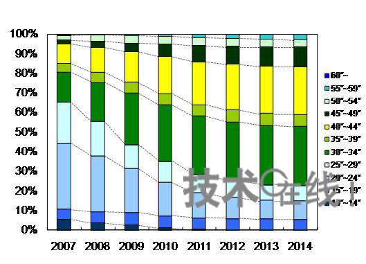 40英寸以上的電視在整體中所占的比例預(yù)計(jì)2010年會(huì)超過30%。2013年會(huì)達(dá)到40%,之后將基本飽和。分地區(qū)來(lái)看,中國(guó)正在追趕在電視大型化方面領(lǐng)先的北美和西歐,從這一點(diǎn)來(lái)看,中國(guó)的影響力會(huì)擴(kuò)大。