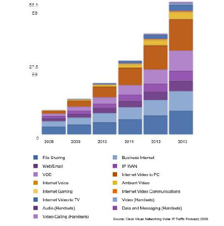 如圖1所示,從2007年到2012年,IP總流量將增加6倍,幾乎每兩年就翻倍。2012年之前,流量每年增長522exabytes(1018,即zettabyte的一半)。這種指數(shù)增長的主要推動力量是高清晰視頻和高速寬帶消費(fèi)類應(yīng)用。