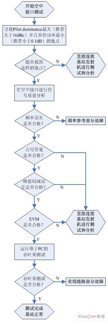 基于方便合理的原則,應(yīng)首先使用空中接口測(cè)量方式在合適的地點(diǎn)檢查基站發(fā)射機(jī)的信號(hào)覆蓋和信號(hào)質(zhì)量,爭(zhēng)取在空口測(cè)試中對(duì)基站狀態(tài)做出準(zhǔn)確判斷。如難以判斷空口測(cè)量結(jié)果或需要精確測(cè)量發(fā)射功率,則需要直接連接基站進(jìn)行測(cè)試。測(cè)試步驟如圖2所示。