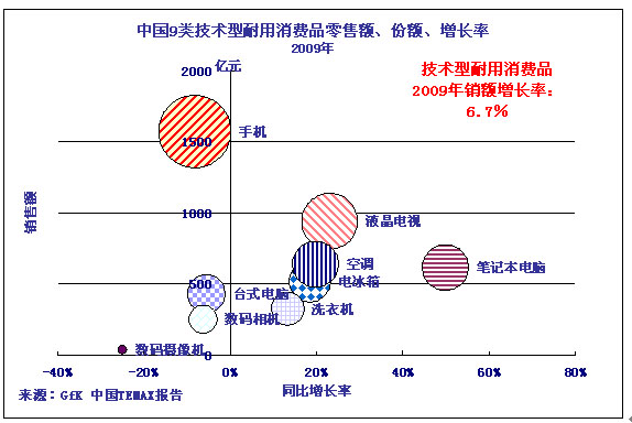 2009年,中國技術(shù)型耐用消費品零售總額8442億元(按1美元=6.82元人民幣計算,為1238億美元),比2008年增長6.7%。這一數(shù)字略低于2008年的同比增長率7.7%,但是,考慮到中國經(jīng)濟(jì)經(jīng)歷了2008年末開始的經(jīng)濟(jì)危機(jī)、2009年上半年的前景不確定性等不利因素,2009年中國技術(shù)型耐用消費品市場還是交出了一份令人比較滿意的答卷。