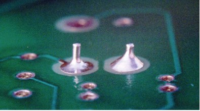 在波峰焊的實(shí)際使用中,助焊劑的全板噴涂和錫渣的產(chǎn)生都帶來(lái)了較高的使用成本。尤其當(dāng)使用無(wú)鉛焊料時(shí),由于無(wú)鉛焊料的價(jià)格是有鉛焊料的3倍以上,錫渣產(chǎn)生所帶來(lái)的使用成本增加是驚人的。此外,無(wú)鉛焊料不斷溶解線(xiàn)路板焊盤(pán)上的銅,時(shí)間一長(zhǎng)便會(huì)在錫缸中產(chǎn)生晶須(銅),這需要我們不斷添加昂貴的錫銀來(lái)加以解決。(見(jiàn)圖4)