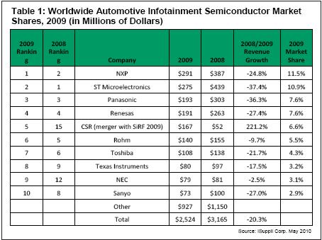 顯然,2009年汽車產(chǎn)業(yè)衰退導(dǎo)致總體市場遭受嚴(yán)重打擊,總體專用半導(dǎo)體營業(yè)收入比2008年的32億美元下降20%,僅略高于25億美元。供應(yīng)鏈中的多數(shù)廠商營業(yè)收入下降20-35%,甚至大型知名半導(dǎo)體廠商亦發(fā)生虧損。日本汽車產(chǎn)量下降近34%,歐洲/中東/非洲(EMEA)地區(qū)產(chǎn)量罕見地下降23%,美國汽車產(chǎn)量亦下降25%,導(dǎo)致信息娛樂半導(dǎo)體受到打擊。