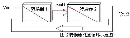 要實(shí)現(xiàn)節(jié)能循環(huán)利用,主要考慮將消耗在電阻負(fù)載上的能量更加合理的利用。如果能將輸出電壓Vout再還原為輸入電壓Vin,則輸出電能轉(zhuǎn)換為輸入的電能,便可以實(shí)現(xiàn)電能的循環(huán)利用,如圖2所示:將原有轉(zhuǎn)換器的電阻負(fù)載R1用等效輸入阻抗的轉(zhuǎn)換器2取代,轉(zhuǎn)換器2的輸出接轉(zhuǎn)換器1的輸入。則與R1等效輸入阻抗的轉(zhuǎn)換器2從轉(zhuǎn)換器1輸出端消耗的能量被轉(zhuǎn)換到轉(zhuǎn)換器1的輸入端,再經(jīng)轉(zhuǎn)換器1又到轉(zhuǎn)換器2的輸入端,實(shí)現(xiàn)了能量的循環(huán)利用。如果在理想情況下,沒有轉(zhuǎn)換損耗,則系統(tǒng)可以自循環(huán)工作。當(dāng)然這是無法實(shí)現(xiàn)的,所以在能量分析時(shí),要引入轉(zhuǎn)換過程的消耗。