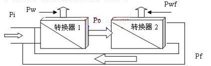 第二種工作模式是引入能量反饋的情況下,能量轉(zhuǎn)換如圖3所示:轉(zhuǎn)換器1為需要例行使用的電源轉(zhuǎn)換器,轉(zhuǎn)換器2為用于能量反饋的轉(zhuǎn)換器,Pi為系統(tǒng)外給轉(zhuǎn)換器1的輸入能量,Pw為轉(zhuǎn)換器1轉(zhuǎn)換過程中的消耗能量,Po為例行使用電源轉(zhuǎn)換器1正常應(yīng)輸出的能量,同時(shí)也是轉(zhuǎn)換器2的輸入能量;Pwf為用于能量反饋的轉(zhuǎn)換器2轉(zhuǎn)換過程中的消耗能量,Pf為轉(zhuǎn)換器2反饋給電源轉(zhuǎn)換器1的能量。