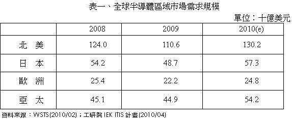 2009年全球半導(dǎo)體市場(chǎng)僅北美地區(qū)微幅成長1.7%,其他皆呈現(xiàn)負(fù)成長:亞太市場(chǎng)衰退3.5%,歐洲市場(chǎng)衰退21.9%,日本市場(chǎng)衰退21.0%。不景氣使得下游電子產(chǎn)品品牌大廠,如Dell、HP、Sony等廠商增加產(chǎn)品委外代工之比例,以降低生產(chǎn)成本,增加其產(chǎn)品競(jìng)爭力。因此,2009年主要從事代工生產(chǎn)之亞太地區(qū),才會(huì)出現(xiàn)僅小幅衰退之情形。至于北美地區(qū)則是因?yàn)槭艿较掠纹放茝S商降價(jià)促銷成功,使得市場(chǎng)呈現(xiàn)小幅成長。
