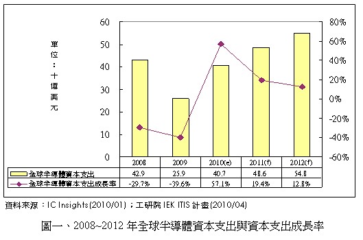 金融風(fēng)暴使得全球廠商皆大幅減少資本支出金額,以保存手中之現(xiàn)金,度過此波不景氣。 2009年全球半導(dǎo)體資本支出為259億美元,較2008年429億衰退39.6%。然而,在看好今年歐美主要消費(fèi)市場(chǎng)需求之復(fù)蘇,以及新興市場(chǎng)需求力道可望持續(xù)下,2010年全球半導(dǎo)體廠商將提高資本支出達(dá)407億美元規(guī)模,較2009年大幅成長57.1%。其中,全球記憶體廠商大幅提高資本支出,以提升其先進(jìn)制程水準(zhǔn),是主要?jiǎng)恿χ弧?br />