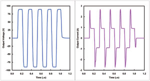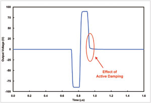 我們可以直觀地理解超聲波發(fā)送器輸出的對稱性要求。然而,這里需要深入理解的是輸出信號不必為一個(gè)長脈沖群。它可能包括一個(gè)單正極和負(fù)極脈沖對,脈沖對的前后均為0V。同樣,信號歸至0V的質(zhì)量變得至關(guān)重要。有時(shí),它被稱為“阻尼”函數(shù)(見圖3),并對一些超聲波模式產(chǎn)生巨大的影響,例如,人體非線性為主要信息源的諧波成像等。