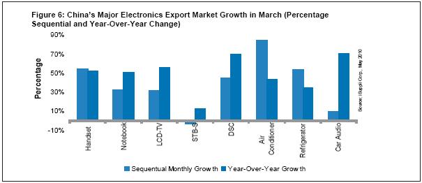 3月份手機出口達(dá)到6100萬部,比上月增長54%,比2009年同期增長52%。3月份筆記本出口達(dá)到1400萬臺,環(huán)比增長32%,比去年同期上升50%。中國液晶電視出口市場環(huán)比增長31%,達(dá)到340萬臺,比2009年同期勁增56%。