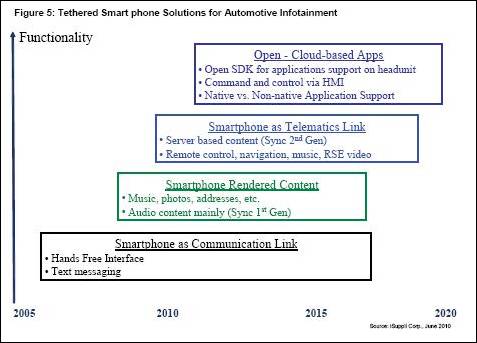 從信息娛樂(lè)角度來(lái)看,iSuppli公司認(rèn)為將轉(zhuǎn)向分層式軟件架構(gòu),設(shè)備在整體產(chǎn)品壽命期內(nèi)不被鎖定。通過(guò)Genivi、Android或Windows Embedded Automotive實(shí)現(xiàn)的本地應(yīng)用支持,提供支持這種功能的靈活性。iSuppli公司還認(rèn)為,Terminal模式將在市場(chǎng)上火起來(lái),盡管面臨挑戰(zhàn)。在中間,有一類(lèi)通過(guò)定制軟件接口運(yùn)行的非本地應(yīng)用,如福特的Sync,或者家中眾多其它的連網(wǎng)設(shè)備。