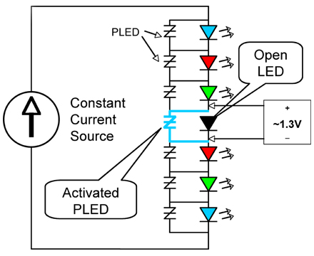 PLED設(shè)計(jì)是一種電壓觸髮型電子分路裝置,當(dāng)某個(gè)LED出現(xiàn)開路故障時(shí),該裝置能夠提供電流旁路。當(dāng)某個(gè)LED故障時(shí),該設(shè)計(jì)可避免整個(gè)LED燈串都無法正常工作的情況。