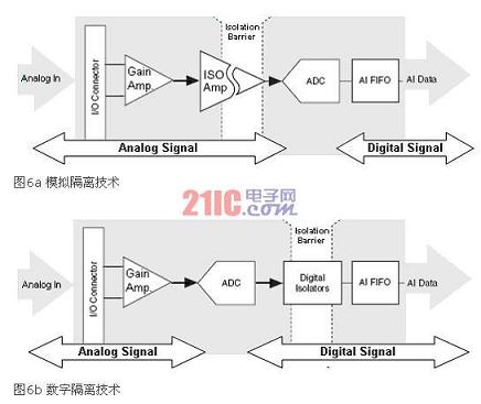 現(xiàn)今,許多商業(yè)現(xiàn)成可用(COTS)組件都含有上述隔離實(shí)現(xiàn)技術(shù)之一。對于模擬I/O通道,您可以在模數(shù)轉(zhuǎn)換器(ADC)完成信號的量化處理之前(模擬隔離)或之后(數(shù)字隔離)在設(shè)備的模擬部分實(shí)現(xiàn)隔離功能。根據(jù)您的隔離實(shí)現(xiàn)在電路中位置的不同,您需要依據(jù)其中的一種技術(shù)來設(shè)計不同的電路。您可以基于您的數(shù)據(jù)采集系統(tǒng)性能、成本和物理需求,選擇模擬或數(shù)字隔離技術(shù)。圖6a和6b展示了實(shí)現(xiàn)隔離功能的不同階段。