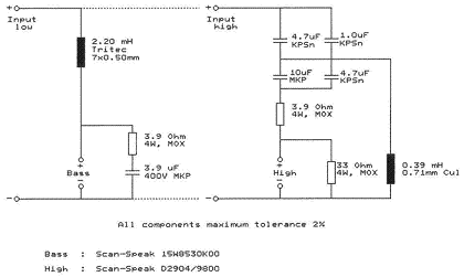 高音單元的3階高通濾波部分由C2、C3和L2組成,其頻響滾降率為每倍頻程18dB。由于兩個單元的靈敏度不相同,分壓器R1-R3使加到高音單元LS2的功率衰減5dB,以便使兩個單元的聲輸出保持一致。C2和C3對音箱的性能有很大影響,必須由高品質(zhì)電容器來擔(dān)任,至少要用金屬化聚丙烯(MKP)電容器。據(jù)設(shè)計者介紹,C2最好是由一只1pF與一只4.7pF的錫箔式(KPSn)電容器并聯(lián)組成,C3則由兩只并聯(lián)的10uFMKP電容器與一只47uFKPSn電容器串聯(lián)組成。但試聽時,在裝有MKP電容器的樣品與另一個裝有KPSn電容器的樣品之間并末聽出差別。[page]