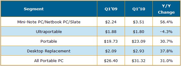 第一季上網(wǎng)本及平板電腦的均價增長并非來自于Apple iPad,因?yàn)榈谝患径萯Pad出貨量還不是很多,主要是有許多具有特色新產(chǎn)品推出與第二代CPU采用推動了上網(wǎng)本與平板電腦價格的上漲,進(jìn)而促進(jìn)出貨金額的增長。在超可攜式電腦市場,一批新產(chǎn)品的發(fā)布與一月份CES的展示推動了出貨,季度出貨金額增長率達(dá)6%;不過這樣的增長幅度仍低于一年前的水位,主要是這個應(yīng)用對企業(yè)市場依賴性較高,而企業(yè)市場能見度還不是很明朗。