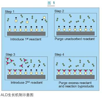 ALD的基本步驟如圖一所示。這種淀積過程是在經(jīng)過活性表面處理的襯底上進(jìn)行的。首先將第一種反應(yīng)物引入反應(yīng)室使之發(fā)生化學(xué)吸附,直至襯底表面達(dá)到飽和。過剩的反應(yīng)物則被從系統(tǒng)中抽出清除,然后將第二種反應(yīng)物放入反應(yīng)室,使之和襯底上被吸附的物質(zhì)發(fā)生反應(yīng)。剩余的反應(yīng)物和反應(yīng)副產(chǎn)品將再次通過泵抽或惰性氣體清除的方法清除干凈。這樣就可得到目標(biāo)化合物的單層飽和表面。這種ALD的循環(huán)可實(shí)現(xiàn)一層接一層的生長從而可以實(shí)現(xiàn)對(duì)淀積厚度的精確控制。