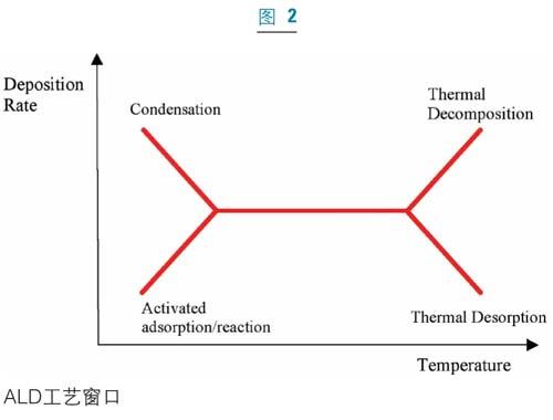 由于ALD是基于在交互反應(yīng)過程中的自約束性生長,此工藝必須經(jīng)過精細(xì)的調(diào)節(jié)來達(dá)到最合適的結(jié)果。即使原子層淀積唯一的表面反應(yīng)特征降低了正?;瘜W(xué)氣相淀積對(duì)溫度、壓力和組分的嚴(yán)格要求,人們?nèi)匀恍枰獌?yōu)化ALD的參數(shù)以實(shí)現(xiàn)其準(zhǔn)確的厚度控制和超級(jí)的保型性。反應(yīng)室溫度是用來控制表面飽和的重要參數(shù)之一,作為ALD的基礎(chǔ),反應(yīng)室溫度起著兩個(gè)主要作用:提供原子層淀積反應(yīng)所需的激活能量和幫助清除單原子層形成過程中的多余反應(yīng)物和副產(chǎn)品。單原子層形成最理想的ALD溫度窗口,如圖2所示。ALD工藝窗口與反應(yīng)物的選擇、用量以及清除息息相關(guān)。為了獲得完全的單層覆蓋,足量的具有熱穩(wěn)定性的反應(yīng)物,即在反應(yīng)溫度下不會(huì)分解的反應(yīng)物,被引入到襯底上。人們往往使用過量的反應(yīng)物來確保實(shí)現(xiàn)完全覆蓋。通常采用以下幾種參數(shù)來控制反應(yīng)物的劑量:反應(yīng)物源的溫度、流量、分壓以及這個(gè)反應(yīng)室的壓力。