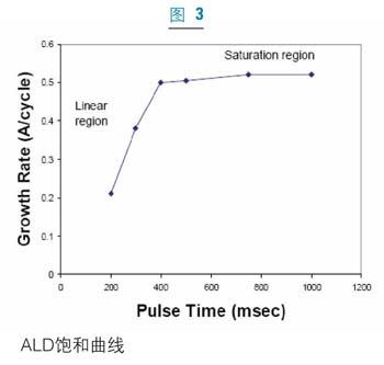 圖3中的飽和曲線說明了ALD過程的自約束特性。生長率隨脈沖時(shí)間呈線性增長,直到達(dá)到飽和條件。達(dá)到飽和以后,增長率為常數(shù),且不再隨脈沖時(shí)間變化而變化。但是,如果同時(shí)存在一種寄生的CVD生長成分或反應(yīng)物的分解的話,增長率就會(huì)顯著增加。因而,飽和曲線通常用來確定ALD的純度。ALD生長速率介于每循環(huán)0.3埃到1.5埃間。雖然ALD的生長速率在制備很薄的膜(<200埃)時(shí)還可以接受,但在用ALD生長厚膜時(shí),生長周期就成為挑戰(zhàn)。