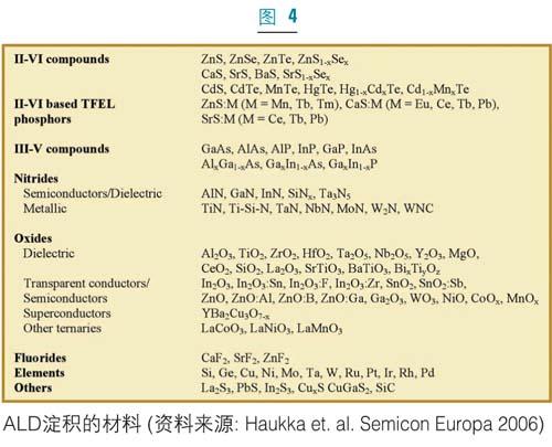 因?yàn)锳LD在半導(dǎo)體制造的不同領(lǐng)域都經(jīng)過評(píng)估和采用,所以選擇合適的原始反應(yīng)物(precursor)就變得日益重要。ALD原始反應(yīng)物應(yīng)當(dāng)具備幾個(gè)“理想”的品質(zhì),即要具有一定的揮發(fā)性和可重復(fù)的汽化率;理想情況下不應(yīng)在反應(yīng)溫度下發(fā)生自身反應(yīng)或分解;應(yīng)當(dāng)極易與補(bǔ)充反應(yīng)物發(fā)生反應(yīng);應(yīng)能產(chǎn)生可揮發(fā)的副產(chǎn)品;基于生長速率和成核的原因應(yīng)具有最佳的配合基尺寸。為了使用方便,原始反應(yīng)物最好為液體有機(jī)金屬物,但是薄膜的性質(zhì)和應(yīng)用指標(biāo)(如雜質(zhì)含量、電學(xué)特性等)應(yīng)該決定材料的選擇。另外,對(duì)制備成本的關(guān)注也要求反應(yīng)源能與傳統(tǒng)的制備工藝在成本上更有競爭性。ALD具有很高的反應(yīng)源的使用效率,這通常能平衡新反應(yīng)源的高價(jià)格。隨著ALD進(jìn)入大規(guī)模生產(chǎn),并且工業(yè)界減少對(duì)反應(yīng)源的選擇,對(duì)成本的顧慮將可能會(huì)隨著化學(xué)品供應(yīng)商規(guī)?;渖L流程而減輕。利用現(xiàn)有的反應(yīng)源,目前人們已經(jīng)可以制備多種多樣的ALD薄膜(圖4)。