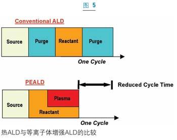 雖然ALD最初僅被視為一個(gè)純粹的熱工藝,但是對(duì)基本的原子層淀積循環(huán)的微小變更已經(jīng)提出了多年。最常見的變種是等離子體增強(qiáng)原子層沉積工藝(PEALD)。PEALD可取消原子層淀積中的一個(gè)步驟,從而進(jìn)一步縮短生產(chǎn)周期。PEALD過程中,在淀積溫度下互不發(fā)生反應(yīng)的互補(bǔ)反應(yīng)源在同一時(shí)間被引入到反應(yīng)室,然后反應(yīng)源關(guān)閉并凈化反應(yīng)室,接著施加一個(gè)直接的等離子脈沖,這個(gè)等離子體環(huán)境產(chǎn)生高活性自由基并與吸附于襯底的反應(yīng)物反應(yīng)。關(guān)閉等離子可迅速清除活性自由基源,反應(yīng)室中一直流過的清潔氣體將清除過剩自由基和反應(yīng)副產(chǎn)物(圖5)。除了較高的生長速度和較短的周期時(shí)間,PEALD薄膜表現(xiàn)出比傳統(tǒng)的原子層淀積薄膜更高的密度和更高的擊穿電壓。該技術(shù)已經(jīng)在多個(gè)應(yīng)用中取得了發(fā)展,如DRAM、MIM和eDRAM電介質(zhì)薄膜。不過在一些關(guān)鍵的薄膜應(yīng)用中,如高功率柵介質(zhì),等離子損傷以及界面氧化的顧慮阻礙了PEALD技術(shù)的廣泛應(yīng)用。