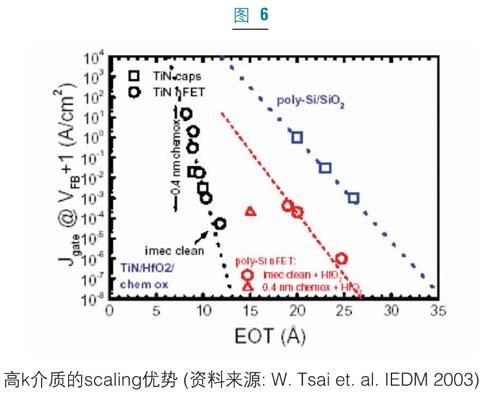 當(dāng)高k材料替代二氧化硅材料后,金屬柵必須取代傳統(tǒng)的多晶硅柵以充分實(shí)現(xiàn)電學(xué)優(yōu)勢(shì)。由于費(fèi)米能級(jí)釘扎效應(yīng),多晶硅耗盡和化學(xué)不穩(wěn)定性,多晶硅柵電極已被發(fā)現(xiàn)與高k柵介質(zhì)不兼容。圖6顯示了二氧化硅(SiO2)和二氧化鉿(HfO2)柵介質(zhì)的柵級(jí)漏電流比較。在相同的等效氧化層厚度(EOT)下,HfO2/TiN柵堆的柵漏電流要比傳統(tǒng)的SiO2/Poly-Si柵堆的柵漏電流小好幾個(gè)數(shù)量級(jí)。