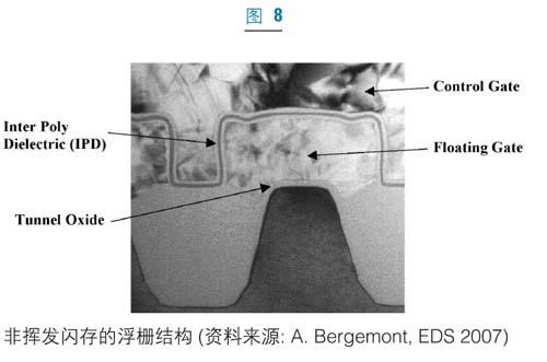在非揮發(fā)性存儲(chǔ)器的應(yīng)用中,人們也開始研究ALD在介質(zhì)和金屬淀積中的應(yīng)用。閃存技術(shù)主要由浮柵(floatinggate)技術(shù)主導(dǎo)(圖8)。高k電介質(zhì)目前正被研究作為二氧化硅(SiO2)和氮化硅(Si3N4)柵介質(zhì)的替代品,以改善浮柵和控制柵之間的電容耦合率。到2010年,浮柵技術(shù)可望被一些技術(shù)所取代,例如電荷捕獲存儲(chǔ)器(TANOS,NROM),相變存儲(chǔ)器(PCM)、鐵電記憶體(存儲(chǔ)器),三維堆疊式存儲(chǔ)器也正在研究中。ALD已被用作這些技術(shù)的阻擋層和擴(kuò)散阻擋層。