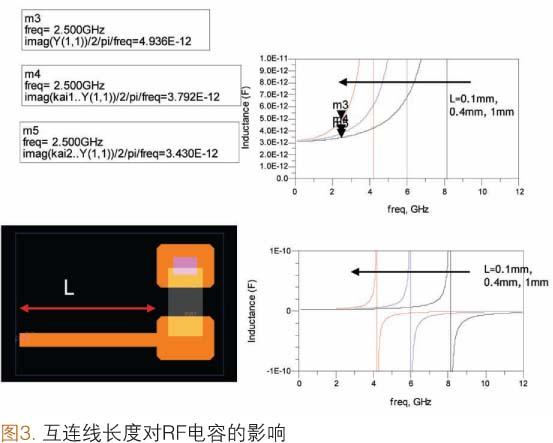 圖3是RF頻段下單個(gè)SMD焊盤(pán)的互連線長(zhǎng)度對(duì)電容影響的簡(jiǎn)單實(shí)例。在這種情況下,3.0pFSMD電容的一個(gè)電極連接在M2層上,形成接地電容。100.0μm寬的互連線與另一個(gè)電極連接在一起。在2.5GHz頻段下,1.0mm長(zhǎng)的互連線可使SMD電容器的等效電容增長(zhǎng)到4.9pF(增大了63%)。當(dāng)然,互連線越短,等效電容與本征電容(3.0pF)的值就越接近。然而,通常使用長(zhǎng)互連線連接SMD元件是不可避免的。在這種情況下,考慮互連線對(duì)電容的影響就顯得異常重要(有時(shí)把這種方法稱為對(duì)電容的微調(diào)),否則SiP將無(wú)法正常工作。