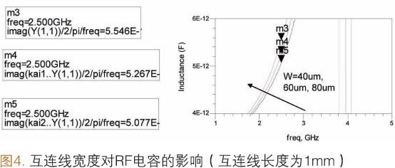 除互連線長(zhǎng)度之外,互連線的寬度也會(huì)對(duì)RF電容產(chǎn)生影響。在襯底的制作過(guò)程中,線寬通常會(huì)發(fā)生變化(舉例來(lái)說(shuō),與設(shè)計(jì)寬度相比,實(shí)際線寬的變化范圍為±10.0μm~±15.0μm)。如圖4所示,如果設(shè)計(jì)的互連線為1.0mm長(zhǎng),60.0μm寬,實(shí)際卻達(dá)到40.0μm寬,在2.5GHz下等效電容變化將達(dá)到5.3%(以3.0pF接地SMD電容為例)。如果把這種SMD電容用于濾波器中,對(duì)于RF應(yīng)用來(lái)說(shuō),電容值5.3%的變化將導(dǎo)致約2.7%的頻移。我們必須對(duì)RF應(yīng)用中含有SMD電容的RFSiP模塊的襯底制造容差進(jìn)行細(xì)致研究。