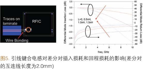 圖5顯示了鍵合引線電感是如何影響差分對(duì)連線的插入損耗的。在實(shí)例中,100.0Ω差分對(duì)的長(zhǎng)度為2.0mm。假設(shè)差分對(duì)的一端使用引線鍵合方式與RFIC連接,并把直接與引線長(zhǎng)度相關(guān)的電感(L)設(shè)為可變值。正像回程損耗曲線圖表示的那樣,加上引線鍵合電感可使差分對(duì)偏離100.0Ω這一匹配條件,結(jié)果使插入損耗增大。在5.0GHz下,0.5nH、1.0nH和1.5nH引線電感的插入損耗分別為0.2dB、0.5dB和1.2dB。即使達(dá)到極高的頻率,疊層上的差分對(duì)本身仍具有良好的阻抗匹配特性。