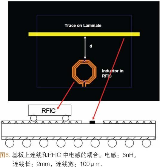 為了對(duì)主時(shí)鐘線和RF元件之間的相互作用進(jìn)行分析,把壓控振蕩器(VCO)中使用的RF電感(6.0nH)放置在穿通多層襯底的時(shí)鐘互連線附近(圖6)。我們?cè)谶@個(gè)研究中使用的互連線長(zhǎng)為2.0mm。當(dāng)VCO電感和互連線之間的橫向距離(d)大于0.5mm時(shí),產(chǎn)生的耦合信號(hào)將小于-80.0dB。耦合信號(hào)的實(shí)際要求由SiP系統(tǒng)級(jí)電設(shè)計(jì)決定。