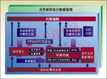 圖1表明了一個典型的由前端到后端的綜合系統(tǒng)設(shè)計(jì)。它始于設(shè)計(jì)定義(原理圖輸入),該設(shè)計(jì)定義與約束編輯緊密集合在一起。在約束編輯中,設(shè)計(jì)者既可定義物理約束又可定義電氣約束。電氣約束將為網(wǎng)絡(luò)驗(yàn)證驅(qū)動仿真器進(jìn)行布局前和布局后分析。仔細(xì)看看設(shè)計(jì)定義,它還與FPGA/PCB集成相鏈接。FPGA/PCB集成的目的是為了提供雙向集成、數(shù)據(jù)管理和在FPGA與PCB之間執(zhí)行協(xié)同設(shè)計(jì)的能力。