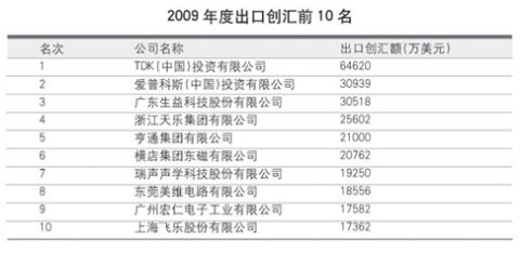 對于中國電子元件行業(yè)的外貿(mào)出口來說,2009年是一個從谷底緩慢爬升的過程。本屆元件百強中出口創(chuàng)匯總額為52.48億美元,同比下降10.38%,占銷售收入總額的28.81%,與上屆元件百強的出口總額相比,下降了9.83%。由于國際金融危機導致了外需萎縮,而且我國刺激內(nèi)需的各項政策效果明顯,一些元件百強企業(yè)開始更多地關注國內(nèi)市場,所以本屆元件百強的出口創(chuàng)匯額雖然下滑,但整體銷售收入仍然獲得增長。