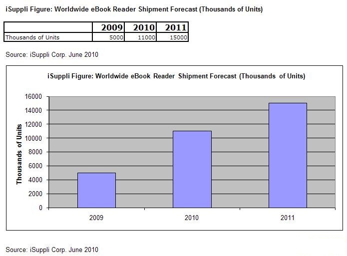 短期內(nèi),當(dāng)電子書閱讀器的價格壓低到iPad起始價格點的一半左右時,可能會吸引消費者購買電子書閱讀器。不過,長期來看,電子書閱讀器仍可能有著比最初預(yù)期的更多利基。iSuppli預(yù)測,全球電子書閱讀器出貨量在2010年將達(dá)1,100萬部,2011年還可望成長120%,達(dá)到1,500萬部。